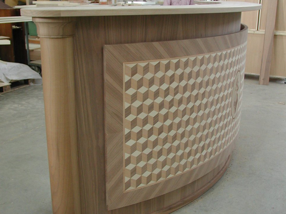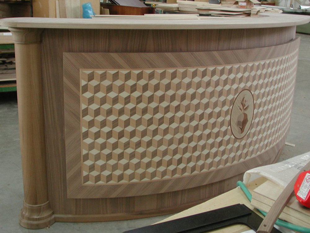 Dalla struttura curva, questo bancone è stato realizzato completamente su misura in multistrato e listellare impiallacciato in noce canaletto, con pannello frontale intarsiato con logo della struttura alberghiera.